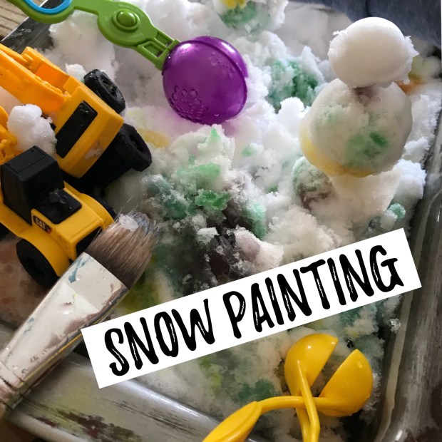Just fill your ice cube tray with cold water and add a couple of drops of food coloring to each cube. Next, head outside and scoop some snow into your pan/bowl. Then, give them a paintbrush and let them paint away! J also loves to play in it with his little construction vehicles as well as make snowmen using these little tongs.