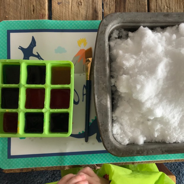 Snow painting is a fun and relatively low mess activity, which is perfect for those snowy days. It also doesn’t take much for supplies either. All you need is a deep baking dish or bowl, paintbrushes, food coloring, an ice cube tray, and snow!