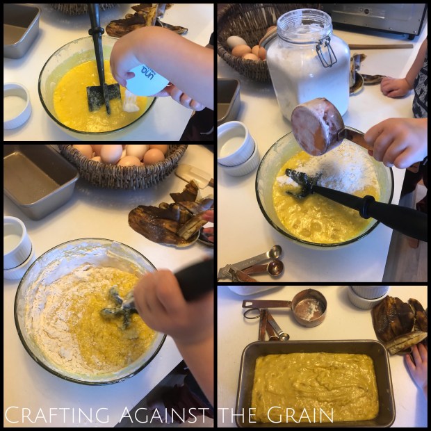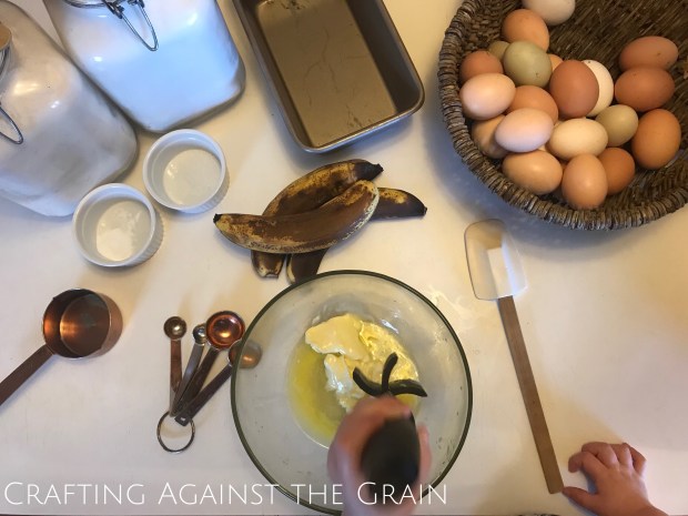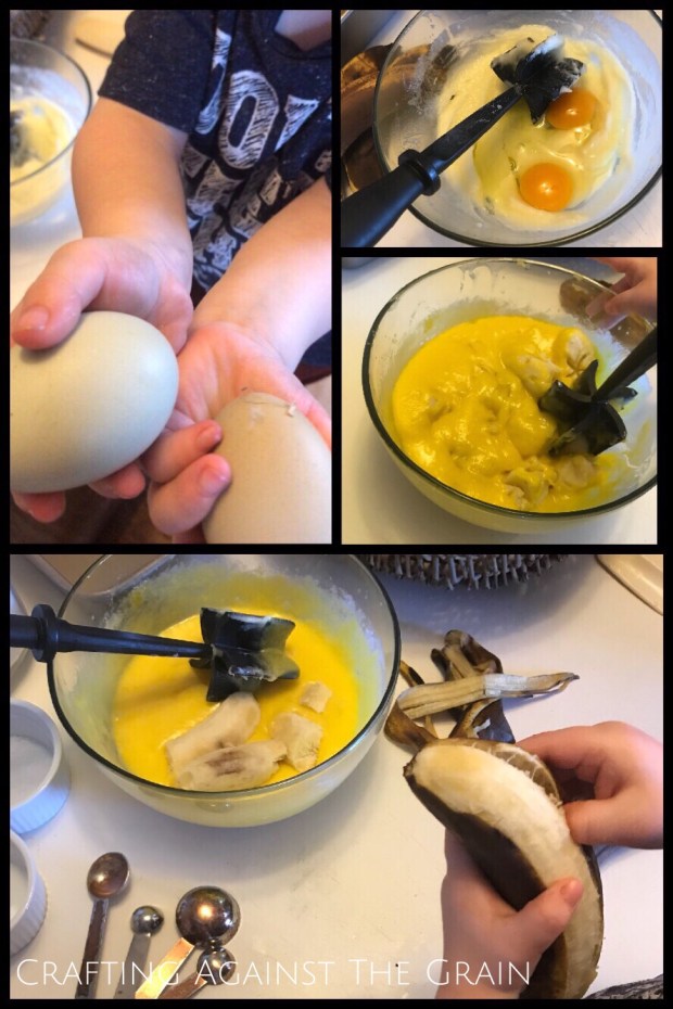 Start by creaming your butter and sugar together in your bowl. The Pampered Chef Mix N Chop 2583 is my preferred masher. I love it because it’s small enough to fit in the bowl and does a better job than any other masher I’ve owned. Plus it works great for chopping up ground beef as well and is the perfect size for small hands. Next, add your two eggs and blend them into your mixture. Then hand the bananas over to your child and let them add them to your bowl and mash them.